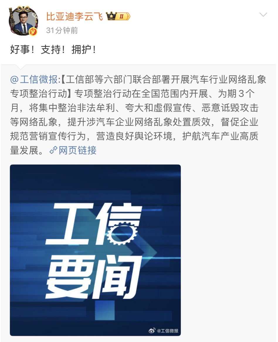 行业监管动态 - 六部门联合部署汽车行业网络乱象专项整治行动 [1] - 专项整治行动涉及工信部等六个部门 [1] 企业回应 - 比亚迪集团品牌及公关处总经理李云飞通过微博公开表态支持专项整治行动 [1] - 企业表态使用"好事 支持 拥护"等措辞表达对监管行动的支持立场 [1]