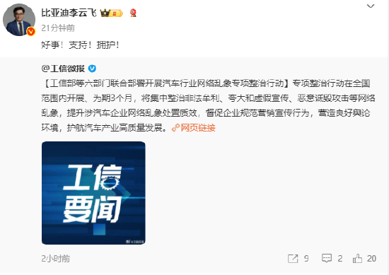 工信部等开展汽车行业网络乱象专项整治行动 比亚迪李云飞:好事!支持!拥护!