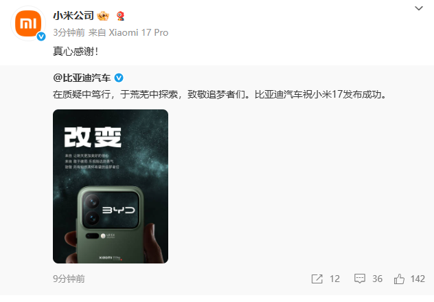 比亚迪汽车祝小米17发布成功 小米回应