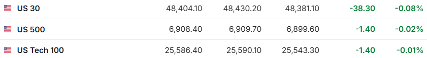 1.12月24日(周三)美股盘前,美股三大股指期货齐跌。截至发稿,道指期货跌0.08%,标普500指数期货跌0.02%,纳指 期货跌0.01%。 | = US 30 | 48.404.10 | 48,430.20 | 48,381.10 | -38.30 | -0.08% | | --- | --- | --- | --- | --- | --- | | 를 US 500 | 6,908.40 | 6,909.70 | 6,899.60 | -1.40 | -0.02% | | 트 US Tech 100 | 25,586.40 | 25,590.10 | 25,543.30 | -1.40 | -0.01% | 2.截至发稿,德国DAX指数涨0.23%,英国富时100指数跌0.26%,法国CAC40指数涨0.10%,欧洲斯托克50指数涨 0.14%。 | 德国DAX30 | 24,340.06 | 24,362.01 | 24,257.47 | +56.09 | +0.23% | | --- | --- | --- | --- | --- | --- | | 器 英国富时100 | 9,863.93 | 9 ...
