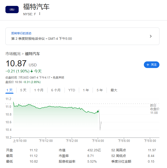 福特汽车二季度调整后EBIT为21亿美元,分析师预期19.1亿美元。预计美国总统特朗普关税将造成公司利润在2025年下滑36%。福特汽车(F)美股盘后跌约3%。