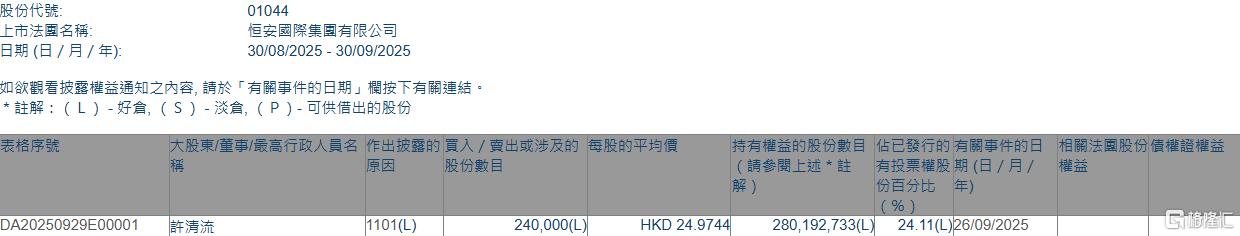 格隆汇9月30日丨据联交所最新权益披露资料显示,2025年9月26日,恒安国际(01044.HK)获执行董事许清流在场内以每股均价24.9744港元增持24万股,涉 资约599.39万港元。 增持后,许清流最新持股数目为280,192,733股,持股比例由24.09%上升至24.11%。 | 股份代號: | 01044 | | --- | --- | | 上市法國名稱: | 恒安國際集團有限公司 | | 日期 (日 / 月 / 年): | 30/08/2025 - 30/09/2025 | | 張格序號 | 大股東/董事/最高行政人員名 作出披露的 買入 / 賣出或涉及的 每股的平均價 | | | | | 持有權益的股份數目 佔已發行的有關事件的日 相關法 | | | --- | --- | --- | --- | --- | --- | --- | --- | | | | 阳灵 | 股份數目 | | | (詩参関上述 * 註 有投票權股 期 (日 / 月 / | | | | | | | | | 一定 份百分比 年) | | | | | | | | | 96 ) | | | DA20250929E00001 ...