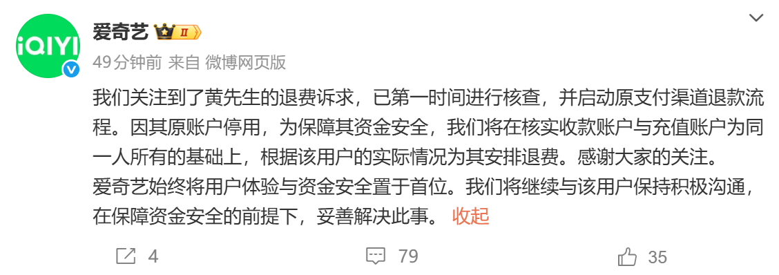 每经AI快讯,12月28日,爱奇艺发文称,关注到了黄先生的退费诉求,已第一时间进行核查,并启动原支付渠道退款流程。因其原账户停用,为保障其资 金安全,我们将在核实收款账户与充值账户为同一人所有的基础上,根据该用户的实际情况为其安排退费。感谢大家的关注。爱奇艺始终将用户体验与资金 安全置于首位。我们将继续与该用户保持积极沟通,在保障资金安全的前提下,妥善解决此事。12月28日,话题"男子爱奇艺会员充了25年遇退费难"登上微 博热搜。据报道,12月25日,河南许昌,黄先生称爱奇艺会员充了25年,现在想退费却遇到了难题。 ...