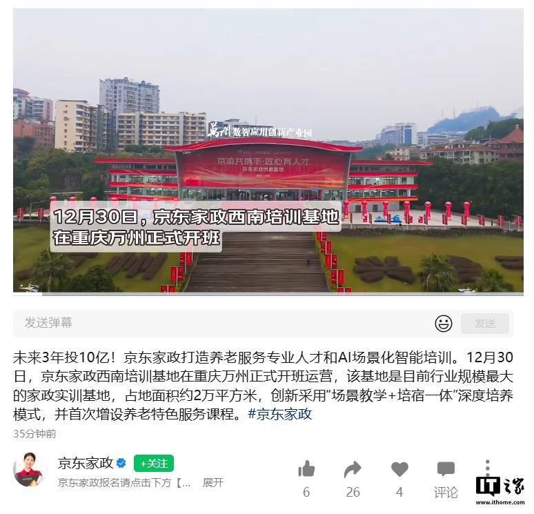 IT之家 12 月 30 日消息,京东黑板报官宣,京东家政西南培训基地于今日在重庆万州正式开班运营,该基地是目前行业规模最大的家政实训基地,占地面 积约 2 万平方米,创新采用"场景教学 + 培宿一体"深度培养模式,并首次增设养老特色服务课程。 IT之家从公告获悉,京东家政宣布未来 3 年投入 10 亿培训建设资金,将重点聚焦: 京东家政宣称打造行业首个三级培训基地模式,贯通"一线城市核心基地-区域中心基地-乡镇培训站点",实现从超大型城市到县域乡镇的全面覆盖。 高标准养老护理课程研发,加强养老服务人才培养,进而推出标准、规范、安全的养老特色服务; 引入 AI 助教与 VR 实训等智能化培训手段; 建设超 150 家标准化培训基地,组建千人规模教师团队; 构建集实训管理、就业匹配与质量追溯于一体的综合管理系统,以提升培训效率和服务质量。 京东家政采用"场景教学 + 培宿一体"深度培养模式。截至目前,京东家政三级培训基地总面积已达 15 万平方米,相当于 1 万个普通家庭房间的面积。 以新启用的西南培训基地为例,基地内 1:1 还原真实工作场景,设有卧室、厨房、浴室等特色教学区,开设涵盖日常保洁、家电清洗、洗衣 ...