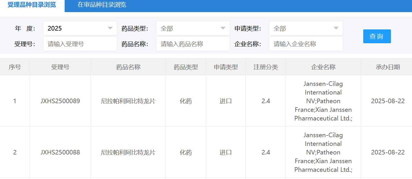 药品注册进展 - 强生尼拉帕利阿比特龙片新适应症上市申请获国家药品监督管理局药品审评中心受理 推测适应症为激素依赖性前列腺癌 [1] - 受理号为JXHS2500089和JXHS2500088 药品类型为化药 申请类型为进口 注册分类为2.4 [2] 药品背景与市场地位 - 尼拉帕利阿比特龙为强生推出的复方制剂 2023年先后在欧盟和美国获批上市 用于治疗BRCA1/2突变的转移性去势抵抗性前列腺癌成人患者一线治疗 [2] - 该药于2024年10月首次在国内获批上市 成为国内首个且唯一获批的双效复方制剂 [2] 临床试验安全性数据 - 3/4级不良事件发生率在试验组中为75.2% 在对照组中为58.9% 最常见不良事件为贫血和高血压 [3] - 因不良事件导致的停药发生率较低 试验组为11.0% 对照组为6.9% [3]