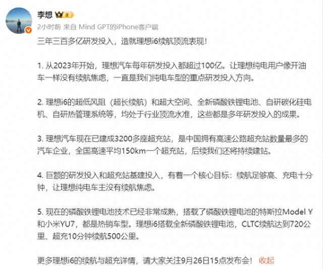 具体来看,理想汽车现在已建成3200多座超充站,全国高速平均150km一个超充站,后续还将持续建 站。李想还介绍,磷酸铁锂电池技术已经非常成熟,搭载了磷酸铁锂电池的特斯拉Model Y和小米 YU7,都是热销车型。理想i6搭载全新磷酸铁锂电池,CLTC续航达到720公里、超充10分钟续航500公 里。 凤凰网科技讯 9月24日,理想汽车CEO李想发文称,"三年三百多亿研发投入,造就理想i6续航顶流表 现"。 他表示:"从2023年开始,理想汽车每年研发投入都超过100亿。让理想纯电用户像开油车一样没有续航 焦虑,一直是我们纯电车型的重点研发投入方向。" ...