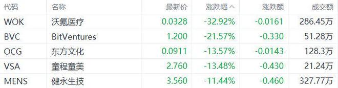 | 代码 | 名称 | 最新价 | 涨跌幅 ^ | 涨跌额 | 成交额 | | --- | --- | --- | --- | --- | --- | | WOK | 沃氪医疗 | 0.0328 | -32.92% | -0.0161 | 286.45万 | | BVC | BitVentures | 1.200 | -21.57% | -0.330 | 51.28万 | | OCG | 东方文化 | 0.0911 | -13.57% | -0.0143 | 128.3万 | | VSA | 童程童美 | 2.760 | -13.48% | -0.430 | 21.24万 | | MENS | 健永生技 | 3.560 | -11.44% | -0.460 | 327.77万 | 中概股收盘跌幅居前的个股为:沃氪医疗跌32.92%,BitVentures跌21.57%,东方文化跌13.57%,童程童 美跌13.48%,健永生技跌11.44%。(格隆汇) ...