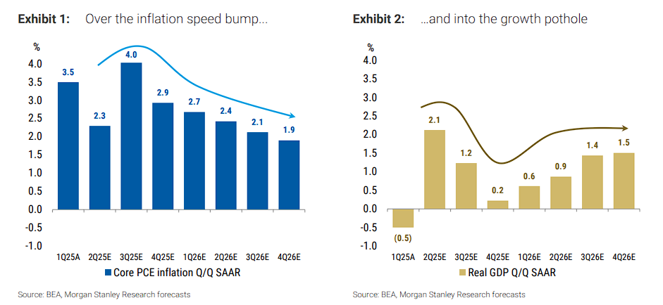 大摩警告,市场低估了关税对美国经济的潜在冲击,情绪过于自满,建议投资者买入美债、卖出美元,以对冲市场过度乐观情绪。 7月29日,据追风交易台消息,摩根士丹利在最新研报中称,该行经济学家基准预测显示,关税将使美国经济在2025年三季度跨过通胀"减速带",随即在 四季度陷入增长"坑洼"。然而风险市场对这两种情况都显得漠不关心。 大摩建议投资者通过买入美国国债和卖出美元来对冲市场的自满情绪,并指出,虽然通胀上升已得到充分预期,但增长放缓可能令美联储和投资者措手不 及,这将推动美债收益率和美元走低。 大摩表示,当前CEO信心和关税向消费者价格的传导都未对美国经济构成威胁,但投资者应警惕"关税疲劳症",未来六个月经济将经历动荡。 值得注意的是,摩根士丹利经济学家对2025年增长放缓的预测比美联储FOMC参与者的中值预测更为悲观,尽管两者对通胀和劳动力市场路径的预测相 似。 关税冲击路径:从通胀减速带到增长坑洼 摩根士丹利经济学家基线预测描绘了一个清晰的关税冲击时间线:关税将在2025年三季度推高通胀(通胀减速带),随后立即在四季度拖累经济增长(增 长坑洼)。 具体而言: 核心PCE通胀率将从2025年二季度的2.3%跃 ...