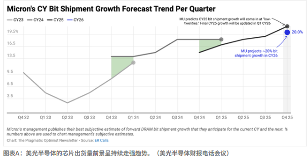 智通财经APP获悉,出色的2026财年第一季度财报表现,加上DRAM价格持续上涨的最新结果,分析师 Uttam Dey现在认为美光股价能够继续上涨,其给予美光科技(MU.US)"买入"评级。 上周发布的最新数据显示DRAM价格飙升,加上美光20%的位元出货量(bit shipment)增长预测,正在 为公司的存储业务创造自1993年以来最强劲的需求/供应动态组合之一。 分析师Dey在上个月下调了美光股票的评级,当时距离公司发布2026财年第一季度财报还有一周时间, 原因是其预计DRAM价格将暂停其天文数字般的上涨。美光第一季度的业绩太好了,远远超出了预期, 这促使该分析师重新评估对公司未来前景的看法。 美光重现1993年狂热 首先,美光对位元出货量给出了非常乐观的展望:管理层将 2025 日历年的全年位元出货量预测从之前 的"15%~19% 区间(high teens)"上调至"20%~23% 左右(low 20% range)"。管理层还透露,预计 2026 日历 年的位元出货量将增长"约 20%"。 美光管理层对其位元出货量展望给出了主观指引,投资者可以看到,20% 的位元出货量展望是近年来 最强劲的水平 ...