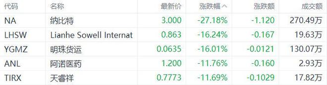 美股异动丨纳比特跌27.18%,为跌幅最大的中概股
