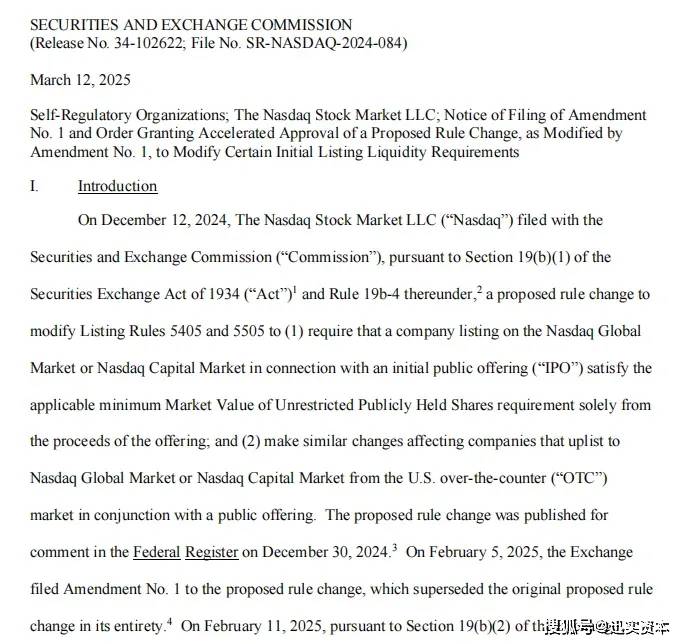 2025年3月12日,美国证券交易委员会(SEC)发布公告,正式批准纳斯达克关于首次上市流动性要求的重大修订(于2024年12月30日提案),新规将在SEC批 准后30天生效(预计2025年4月11日)。 此次调整是近20年来最严格的规则改革,核心在于提高企业IPO及OTC转板门槛,要求新股发行满足流通公众持股市值(MVU PHS)标准,封堵了"老股转 售"漏洞。 纳斯达克新规落地——IPO门槛全面提升,中小企业赴美上市面临更大挑战 *MVUPHS(Market Value of Unrestricted Publicly Held Shares),即非限制性公开持有的股份市值,指不由公司高管/董事/10%股东持有的、且不受任何转 售限制的股份。 壹、纳斯达克旧规定 根据纳斯达克旧规定,企业在计算IPO上市规则里的最低流通股市值(MVUPHS)时,此时流通股定义为,除了在发行中出售的主要股份外,以前发行但已 注册转售的股份(转售股份),且不是公司高管、董事或10%的股东持有,也会被计算为UPHS。此外,对于OTC市场转板的公司,原规则允许公司通过"包 销公开发行至少400万美元"以替代日均交易量(ADV)要求 ...
