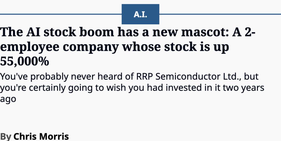 AI泡沫里不仅有神话,还有鬼话。 你可能从未听说过RRP半导体有限公司,但此刻一定在懊悔两年前没能押注这家公司。 这家仅2名正式员工的印度公司,在此期间股价竟暴涨550倍! 而过去两年间,英伟达股价涨幅超250%,可谓相形见绌。 印度AI第一妖股 过去20个月,这只股票如搭乘火箭般飙涨超过55,000%,创下连续149个交易日涨停的疯狂纪录,市值从235万元人民币飙升至17亿美元(约120亿元人民 币),增长超500倍。 过去几周,诡异的事件接连发生,几乎堪称荒诞喜剧。 实际上,RRP半导体根本没开展任何形式的半导体制造活动,也未申请任何相关政府项目。 自2024年初转型后,这家公司与半导体最大的关联可能是公司名。 RRP半导体是小盘股,但在18个月内股价飙涨63000%,尽管交易量微乎其微、财务状况模糊且并无实际芯片业务。 Rajendra Chodankar既是马哈拉施特拉邦政府和体育传奇明星Sachin Tendulkar投资的RRP电子公司的发起人,又恰好是RRP半导体的最大股东。 在收购并将「G.D. Trading and Agencies」贸易与中介公司更名为「RRP Semiconductor ...