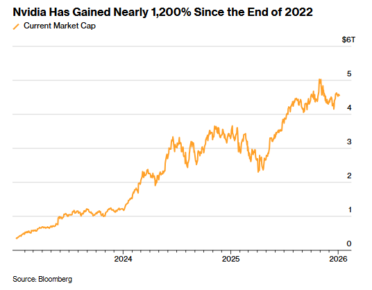 "风险显然已经上升,"资产管理规模达1300亿美元的Advisors Capital Management合伙人兼投资组合经 理JoAnne Feeney评论道。 随着2026年的开启,全球市值最高的公司在股市中的根基正显露出动摇迹象。 智通财经APP获悉,自10月29日创下历史新高以来,英伟达(NVDA.US)股价已累计下跌9.1%,表现远逊 于标普500指数。这反映出投资者日益担忧人工智能(AI)支出的可持续性,以及这家芯片巨头的市场主 导地位。 近期的下跌尤为引人注目。回顾收盘价刷新历史纪录当日,英伟达股价较2022年底涨幅已超过1300%, 公司市值突破5万亿美元,较不到三年前的约4000亿美元大幅跃升。然而如今,短短数月内其市值已蒸 发4600亿美元,致使三年累计涨幅收窄至近1200%。 与此同时,这家占据主导地位的AI芯片制造商正面临前所未有的激烈竞争,对手不仅包括 AMD(AMD.US)等同行,甚至还有其最大的客户——如谷歌(GOOGL.US)和亚马逊(AMZN.US)等。更令 华尔街忧心的是,英伟达对多家客户的投资行为,可能被解读为通过人为手段提振需求。 如果英伟达继续延续这一颓势,将对大多数 ...