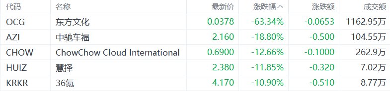| 代码 | 名称 | 最新价 | 涨跌幅へ | 涨跌额 | 成交额 | | --- | --- | --- | --- | --- | --- | | OCG | 东方文化 | 0.0378 | -63.34% | -0.0653 | 1162.95万 | | AZI | 中驰车福 | 2.160 | -18.80% | -0.500 | 104.55万 | | CHOW | ChowChow Cloud International | 0.6900 | -12.66% | -0.1000 | 262.9万 | | HUIZ | 慧择 | 2.380 | -11.85% | -0.320 | 7.02万 | | KRKR | 36氟 | 4.170 | -10.90% | -0.510 | 8.77万 | 中概股收盘跌幅居前的个股为:东方文化跌63.34%,中驰车福跌18.8%,ChowChow Cloud International跌 12.66%,慧择跌11.85%,36氪跌10.9%。(格隆汇) ...