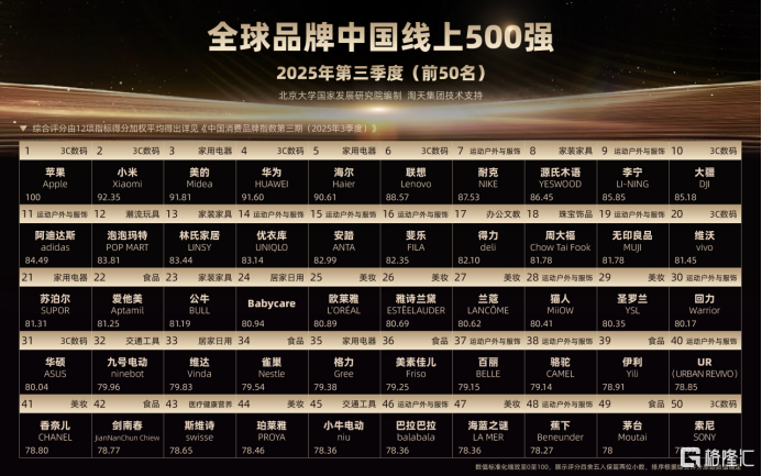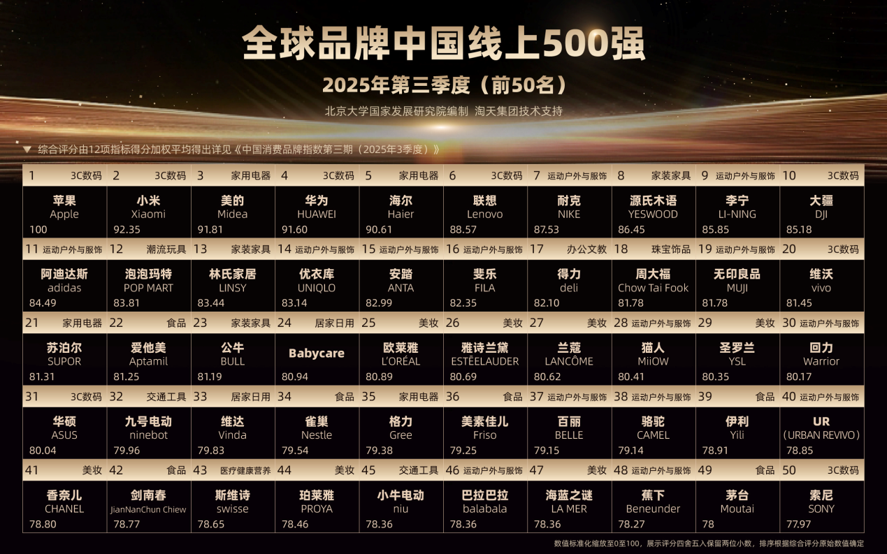 | 全球品牌中国线上500强 | | | | | | | | | | | --- | --- | --- | --- | --- | --- | --- | --- | --- | --- | | 2025年第三季度(前50名) | | | | | | | | | | | 北京大学国家发展研究院编制 淘天集团技术支持 | | | | | | | | | | | ▼ 综合评分由12项指标得分加权平均得出详见《中国消费品牌指数第三期(2025年3季度)》 | | | | | | | | | | | 3C数码 2 3C数码 3 家用电器 4 3C数码 5 家用电器 6 | | | | | | | 3C数码 7 运动户外与服饰 8 家装家具 9 运动户外与服饰 10 3C数码 | | | | 的电影 | 小米 | 美的 | 华为 | 海尔 | 联想 | 耐克 | 源氏木语 | 李宁 | 大疆 | | Apple | Xiaomi | Midea | HUAWEI | Haier | Lenovo | NIKE | YESWOOD | LI-NING | DI | | 100 | 92.35 | 91.81 | 91. ...