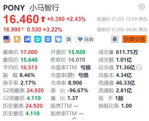 小马智行(PONY.US)盘前涨3.22%,报16.99美元。消息面上,花旗发报告称,英伟达推出的新一代人工 智能平台、开放模型及其生态体系,有望催生对自动驾驶出租车的需求,并支撑全球经济增长。花旗预 计,全球自动驾驶出租车市场规模将从2025年的44.3亿美元扩大至2034年的1889.1亿美元。中国自动驾 驶出租车的可触达市场规模预计将从2025年的3900万美元增至2035年的675.9亿美元。 | PONY 小马智行 | | O | | --- | --- | --- | | 16.460 + +0.390 +2.43% | | 收盘价 01/05 15:59 美东 | | 16.990 t 0.530 +3.22% | | 盘前价 01/06 04:06 美东 | | 一 24 4 5 8 8 日 ♥ 白选 | | ● 快捷交易 | | 最高价 17.000 | 开盘价 15.920 | 成交量 611.75万 | | 最低价 15.640 | 昨收价 16.070 | 成交额 1.01亿 | | 平均价 16.513 | 市盈率TM 亏损 | 总市值 71.36亿 (…) | | 振 幅 8.46 ...