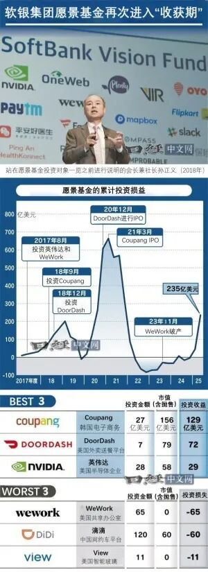 软银集团在2017年推出了10万亿日元规模的愿景基金。通过共同实现孙正义提出的信息革命的"同志式 结合"追求乘积效应。2019年成立了2号基金。截至9月底,两个基金的总投资额已增至1632亿美元(约 合25.3万亿日元),税前投资收益达到约3.7万亿日元。 软银集团在2017年推出了10万亿日元规模的愿景基金。2019年成立了2号基金。截至9月底, 两个基金的总投资额已增至1632亿美元(约合25.3万亿日元),税前投资收益达到约3.7万亿 日元…… 日本软银集团(SBG)旗下的基金软银愿景基金(SVF)表现强劲。虽然一度陷入困境,但会长兼社长 孙正义培育的"金蛋"上市,2025年4~9月推动软银集团创出了利润新高。愿景基金的良好业绩增强了软 银集团的资金实力,支撑了对美国OpenAI等人工智能(AI)领域的巨额投资。 "同志式结合" 软银集团的首席财务官(CFO)后藤芳光在11月的财报发布会上表示,"久违地迎来了松一口气的秋 天",透露了内心感觉。这是因为经过投资对象美国WeWork破产等数年的困境,愿景基金的投资收益在 7~9月的合并财报中恢复到近3万亿日元的水平。 软银集团将基于基金的投资和直接投资予以 ...