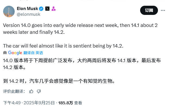 马斯克官宣特斯拉FSD V14即将推送:分三步走,号称史上第二大更新