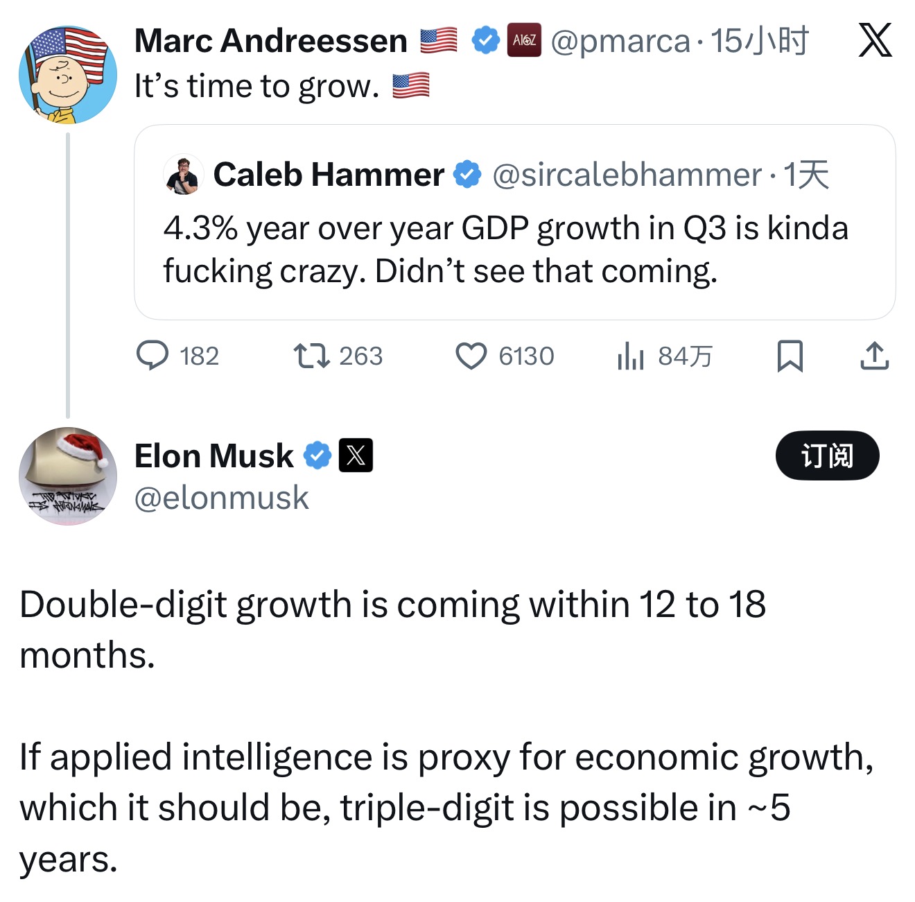 新华财经北京12月25日电特斯拉公司首席执行官、太空探索技术公司创始人埃隆·马斯克25日在社交媒体上表示,如果应用人工智能介入经济活动,美国经 济在未来一段时间能实现"两位到三位数的增长"。 不过马斯克的"预测"引发诸多不同意见,有网友劝他:"埃隆,预测准确并不是你的长项"。(记者:马骁) (文章来源:新华社) 美国商务部23日发布数据显示,今年第三季度美国国内生产总值环比按年率计算增长4.3%。有网友在社交媒体上发文说:"增长4.3%太疯狂了,看不出 来。"不过马斯克在这条推文下跟帖说,"在未来12至18个月内,能实现两位数增长,如果应用人工智能加持,甚至能实现三位数增长"。 今年5月底辞任美国政府效率部负责人后,马斯克专注于人工智能企业xAI的人工智能模型"格罗克"的开发训练。他此前多次动用自家商业资源促进xAI发 展。7月,他创立的太空探索技术公司也决定向xAI投资20亿美元。11月,特斯拉股东另外批准给予马斯克1万亿美元薪酬方案,这是有史以来最大的企业薪 酬方案,因为投资者支持他将这家电动汽车制造商转型为人工智能和机器人巨头的愿景。 ...