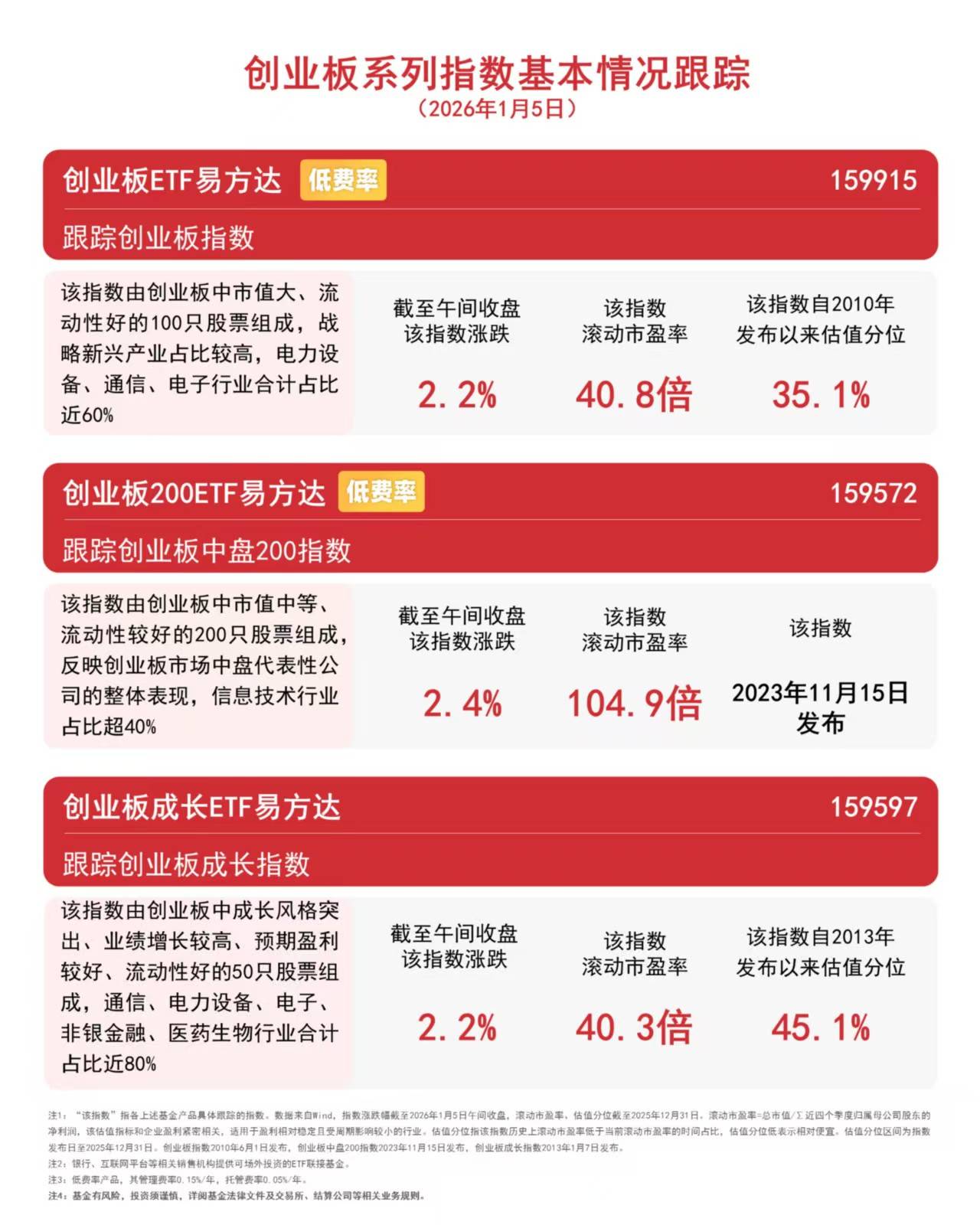 截至午间收盘,创业板中盘200指数上涨2.4%,创业板指数、创业板成长指数均上涨2.2%,创业板ETF易方达(159915)半日成交额超20亿元。 国泰海通证券表示,随着经济转型加快、无风险收益下沉与资本市场改革,中国"转型牛"内在趋势确定。A股市场有望迎接春季"开门红"。AI与新兴市场工 业化趋势下,中国新兴科技与资本品出海景气强势且确定性较高。 | 创业板ETF易方达 低费率 | | | | | --- | --- | --- | --- | | 跟踪创业板指数 | | | | | 该指数由创业板中市值大、流 | 截至午间收盘 | 该指数 | 该指数自2 | | 动性好的100只股票组成,战 | 该指数涨跌 | 滚动市盈率 | 发布以来估 | | 略新兴产业占比较高,电力设 | | | | | 备、通信、电子行业合计占比 | 2. 2% | 40. 8倍 | 35. 1 | | 近60% | | | | | 创业板200ETF易方达 低费率 | | | | | 跟踪创业板中盘200指数 | | | | | 该指数由创业板中市值中等、 | 截至午间收盘 | 该指数 | 该指 | | 流动性较好的200只股票 ...