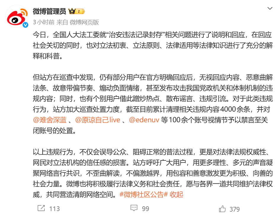 今日,全国人大法工委就"治安违法记录封存"相关问题进行了说明和回应,在回应社会关切的同时,也对立法初衷、立法原则、法律 适用等法律知识进行了充分的解释和科普。 @微博管理员 12月24日发布微博社区公告: 但站方在巡查中发现,仍有部分用户在官方明确回应后,无视回应内容、恶意曲解法条、故意带偏节奏、煽动负面情绪,甚至发布攻 击我国党政机关和体制机制的违规内容;同时,也有个别用户借此蹭炒热点、散布谣言、违规引流。对于此类违规行为,站方加大巡 查处置力度,截至目前累计清理相关违规内容4000余条,并对@难舍深蓝 、@原谅自己live 、@edenuv 等100余个账号视情节予以禁 言至关闭账号的处置。 以上违规行为,不仅会误导公众、阻碍正常的普法过程,更是对法律法规权威性、网民对立法机构的信任感的损害。站方呼吁广大用 户,用更多理性、多元的声音凝聚网络言行共识,不歪曲解读,不偏激越界,用包容和善意激发更为积极、向善的社会力量。微博也 将积极履行法律义务和社会责任,愿与各界一道共同维护法律权威,共同营造清朗网络空间。 ...