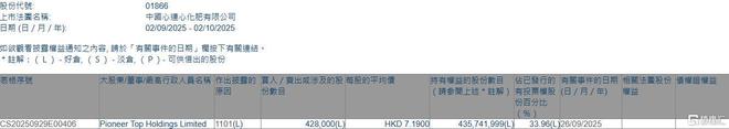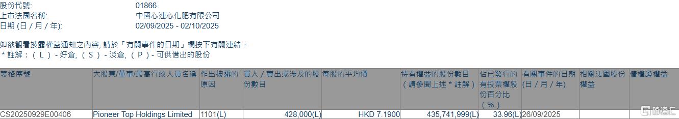 | 股份代號: | 01866 | | --- | --- | | 上市法國名稱: | 中國心壇心化肥有限公司 | | 日期(日/月/年) | 02/09/2025 - 02/10/2025 | | 如欲觀看放露檔益通知之內容,時於「有關事件的日期」欄投下角載擴極。 | | | *註解:(L)-好血(S)-淡血,(P)-可供想出的股份 | | | 2003 | 大星伸撞事(通島行政人員名情 作出技量的 震人/ 藏出或者及的版,每座的平均依 | | 好数图 | | 格隆汇10月2日丨根据联交所最新权益披露资料显示,2025年9月26日,中国心连心化肥(01866.HK)获 Pioneer Top Holdings Limited在场内以每股均价7.19港元增持42.8万股,涉资约307.73万港元。 增持后,Pioneer Top Holdings Limited最新持股数目为435,741,999股,持股比例由33.92%上升至 33.96%。 来源:格隆汇APP | 六是用量要(面積可以人員名稱 作出交量的 高入/國出版 - 及的配件量的手項價 | | 持有哪些到胶的照明 估已预订的 南國中华的日期 制度正 ...