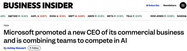 外媒:微软提拔商业业务新CEO 并整合团队参与AI角逐