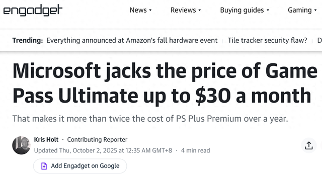 来源:环球网 【环球网科技综合报道】10月2日消息,据外媒engadget报道称,微软宣布对 Xbox Game Pass 阵容进行 大规模调整:顶级套餐 Game Pass Ultimate 即日起提价 50%,上调至 30 美元/月,年费对应 360 美元; 同时新增 45 款游戏,并正式整合 Ubisoft+ 订阅内容与 Fortnite Crew 福利,以强化高价位价值叙事。 据了解,本次调价距离上次(2024 年 7 月)仅 15 个月,期间 Ultimate 费用已上涨 76% 新价格系单月计费,不提供年付或季付折扣选项,360 美元年费约为竞品 PlayStation Plus Premium(160 美元)的2.25 倍。 Xbox 业务负责人菲尔·斯宾塞表示:"我们希望为高端玩家提供整合式价值——一次订阅即可畅玩育碧 新作、获得 Fortnite 额外货币并第一时间体验 Xbox 第一方大作。"微软承认涨价幅度显著,但强调新增 内容零售价已超 35 美元/月,"对多平台、多品类玩家而言整体更划算。" 消息公布后,社交媒体出现"取消订阅"教程刷屏,部分用户担忧连续涨价趋势。分析机构 Omdia ...