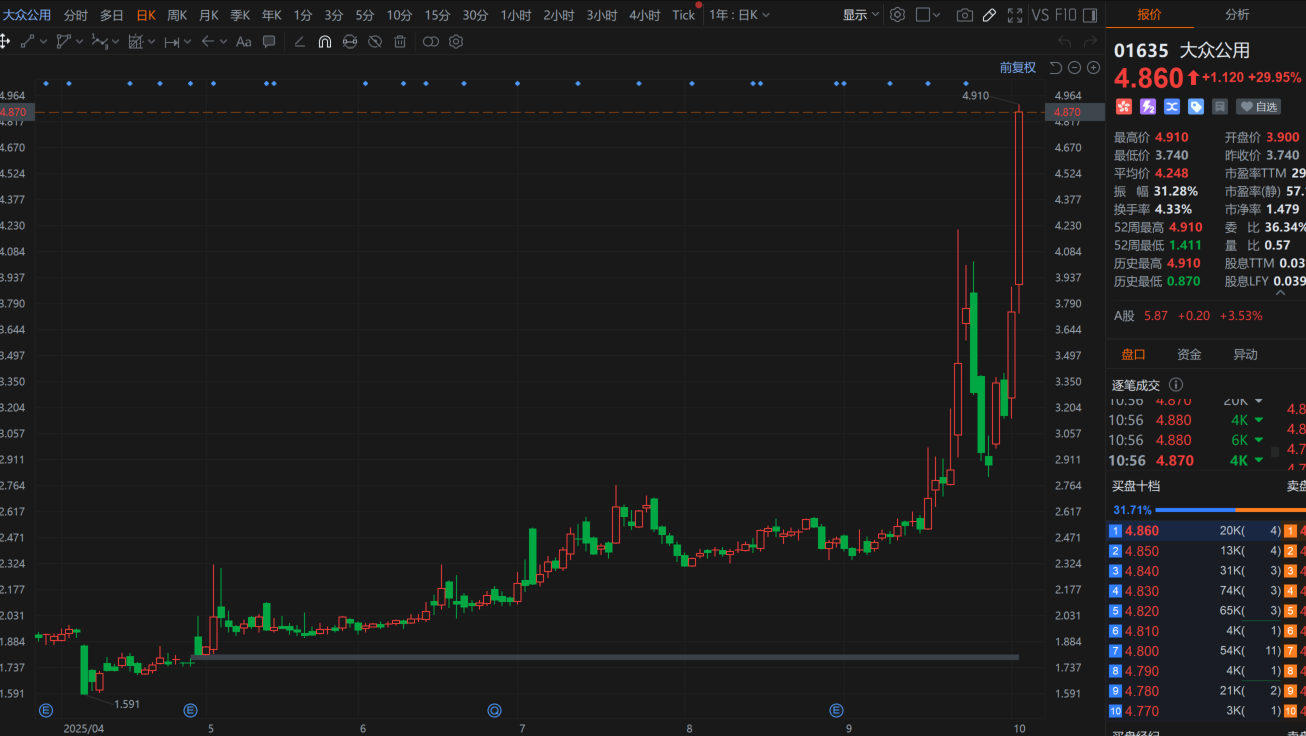 此外,9月26日,上交所官网披露信息显示,摩尔线程科创板IPO申请通过上交所上市委会议审议。摩尔线程成立后曾获得包括深创投在内的多家机构投 资。公开资料显示,大众公用为公用事业与金融创投齐头并进的投资控股型企业,其中,创投业务是大众公用较为重要的业务板块和利润来源,该公司持有 深创投10.80%股权。 10月3日,港股大众公用 (01635.HK)$ 股价持续拉升,现涨超30%,盘中最高见4.9港元,创历史新高。消息面上,大众公用此前在互动平台表示,公司参股 深创投,深创投及其基金持有宇树科技股份。据悉,宇树科技预计于今年四季度向证券交易所提交上市申请文件。 ...