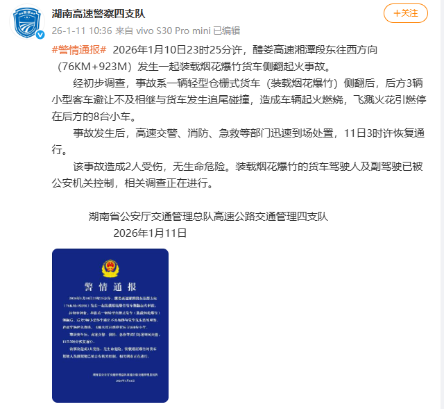 据新京报,1月10日晚,湖南醴娄高速湘潭县段发生多车碰撞事故,多车起火燃烧。画面显示,现场火光冲天,起火的车辆把东往西方向道路完全堵住。 记者从湘潭县应急局获悉,起火车辆中有运输烟花爆竹车辆,火灾已扑灭,无人员伤亡,事故具体原因正在调查中。 记者从湖南高速集团获悉,初查系装载烟花的货车侧翻后引燃,11日凌晨现场已恢复正常通行。 每经编辑|金冥羽 向江林 1月11日,湖南高速警察四支队发布警情通报: 2026年1月10日23时25分许,醴娄高速湘潭段东往西方向(76KM+923M)发生一起装载烟花爆竹货车侧翻起火事故。 经初步调查,事故系一辆轻型仓栅式货车(装载烟花爆竹)侧翻后,后方3辆小型客车避让不及相继与货车发生追尾碰撞,造成车辆起火燃烧,飞溅火花 引燃停在后方的8台小车。 事故发生后,高速交警、消防、急救等部门迅速到场处置,11日3时许恢复通行。 该事故造成2人受伤,无生命危险。装载烟花爆竹的货车驾驶人及副驾驶已被公安机关控制,相关调查正在进行。 此前报道: 编辑|金冥羽 向江林 校对|许绍航 封面图片来源:新京报 每日经济新闻综合自湖南高速警察四支队、新京报 ...