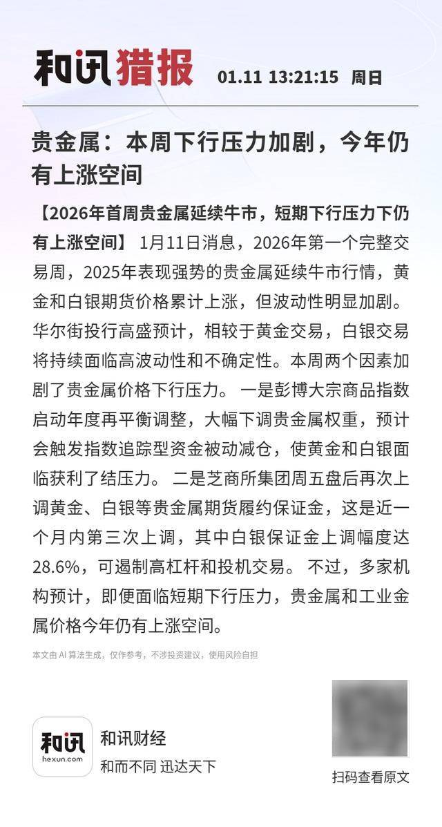 【2026年首周贵金属延续牛市,短期下行压力下仍有上涨空间】1月11日消息,2026年第一个完整交易 周,2025年表现强势的贵金属延续牛市行情,黄金和白银期货价格累计上涨,但波动性明显加剧。华尔 街投行高盛预计,相较于黄金交易,白银交易将持续面临高波动性和不确定性。本周两个因素加剧了贵 金属价格下行压力。一是彭博大宗商品指数启动年度再平衡调整,大幅下调贵金属权重,预计会触发指 数追踪型资金被动减仓,使黄金和白银面临获利了结压力。二是芝商所集团周五盘后再次上调黄金、白 银等贵金属期货履约保证金,这是近一个月内第三次上调,其中白银保证金上调幅度达28.6%,可遏制 高杠杆和投机交易。不过,多家机构预计,即便面临短期下行压力,贵金属和工业金属价格今年仍有上 涨空间。 本文由 AI 算法生成,仅作参考,不涉投资建议,使用风险自担 扫码查看原文 构预计,即便面临短期下行压力,贵金属和工业金 属价格今年仍有上涨空间。 本文由 Al 算法生成,仅作参考,不涉投资建议,使用风险自担 和讯财经 和而不同 迅达天下 ...