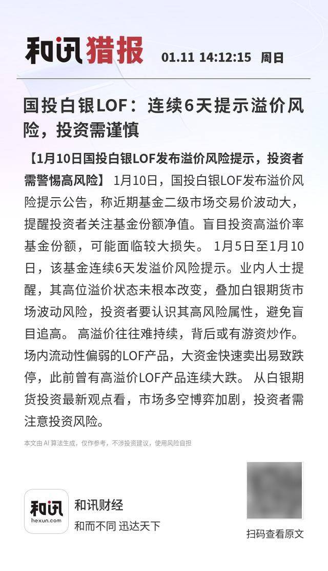 【1月10日国投白银LOF发布溢价风险提示,投资者需警惕高风险】1月10日,国投白银LOF发布溢价风 险提示公告,称近期基金二级市场交易价波动大,提醒投资者关注基金份额净值。盲目投资高溢价率基 金份额,可能面临较大损失。1月5日至1月10日,该基金连续6天发溢价风险提示。业内人士提醒,其高 位溢价状态未根本改变,叠加白银期货市场波动风险,投资者要认识其高风险属性,避免盲目追高。高 溢价往往难持续,背后或有游资炒作。场内流动性偏弱的LOF产品,大资金快速卖出易致跌停,此前曾 有高溢价LOF产品连续大跌。从白银期货投资最新观点看,市场多空博弈加剧,投资者需注意投资风 险。 本文由 AI算法生成,仅作参考,不涉投资建议,使用风险自担 和讯财经 hexun.cor 和而不同 迅达天下 扫码查看原文 本文由 Al 算法生成,仅作参考,不涉投资建议,使用风险自担 ...