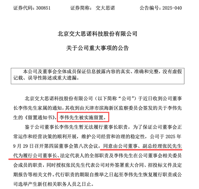 交大思诺9月30日晚间发布公告称,公司于近日收到公司董事长李伟家属的通知,其收到由天津市滨海 新区监察委员会签发的关于李伟的《留置通知书》,李伟被实施留置。 (文章来源:中国证券报) 公告称,鉴于李伟暂无法履行董事长职责,为了保证公司董事会正常运作和经营决策的顺利开展,维护 公司经营和治理的稳定性,公司于9月29日召开第四届董事会第八次会议,同意由公司董事、副总经理 张民代为履行公司董事长、法定代表人的全部职责及李伟在公司董事会相关委员会成员的职责,同时授 权张民代表公司对外签署重大合同、招投标文件及定期报告等相关文件。代行职责的期限自推举之日起 至李伟恢复履行职责或公司选举产生新任相关职务人员之日止。 交大思诺称,公司拥有完善的治理结构及内部控制机制,日常经营管理由公司高管团队负责。目前公司 生产经营管理情况一切正常,其他董事、高级管理人员均正常履职,董事会依法履行相关职责。 截至公告披露日,公司尚未知悉上述事项的进展及结论。公司将持续关注后续进展,对相关工作进行妥 善安排,并按照有关法律、法规的规定和要求,及时履行信息披露义务。 上半年业绩下滑 2025年上半年,公司实现营业收入1.28亿元,同比下降18 ...