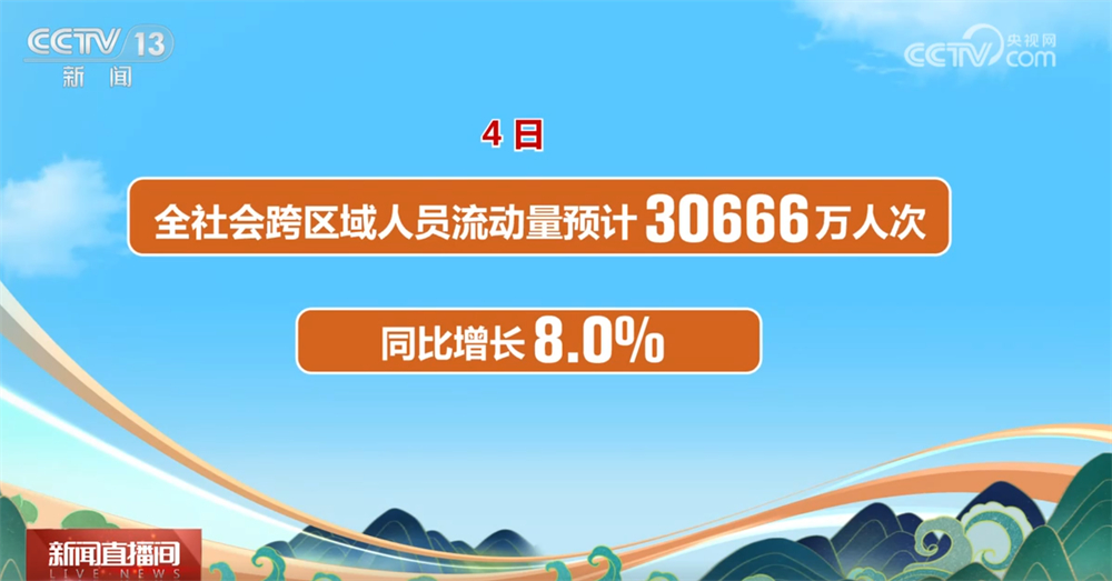 央视网消息:记者从交通运输部了解到,国庆中秋假期前四天,累计全社会跨区域人员流动量预计12.49亿人次。 国庆中秋假期前4天,累计全社会跨区域人员流动量预计12.49亿人次,同比增长5.7%。其中,累计铁路客运量预计7878万人次,同比增长 5.3%。累计公路人员流动量预计115363万人次,同比增长5.6%。累计水路客运量预计681万人次,同比增长11.7%。累计民航客运量预计962万 人次,同比增长5.0%。 国庆中秋假期第四天全国道路交通总体平稳 4日,全国主干公路交通流量仍保持高位运行。全国各级公安交管部门针对假期道路交通特点持续做好秩序管控、疏堵保畅工作。假期进 入后半程,城市周边道路和通往景区道路的交通流量仍将保持高位,部分群众也陆续返程,道路交通流量将出现第二个小高峰。 公安部交通管理局提示:假期过半,建议提前规划安排行程,尽量避开出行高峰和恶劣天气。临近中秋佳节,亲友聚会饮酒增多,要切 记"开车不喝酒,喝酒不开车",要提醒同桌亲友拒绝酒驾醉驾。 4日,全社会跨区域人员流动量预计30666万人次,同比增长8.0%。其中,铁路客运量预计1820万人次,同比增长3.7%。公路人员流动量 预计2842 ...