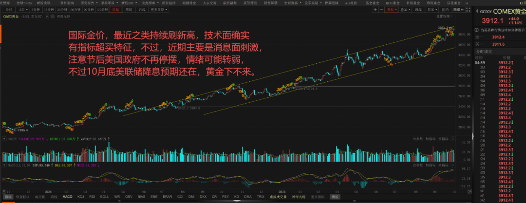 长假期间,停笔好几天,实在忍不住手痒,就梳理一下贵金属和基本金属的消息,让大家也心理有点底,同时也避免周三需要阅读的消息太多。当然,科 技股目前来看也还不错,只不过,走势不太像金银和有色这么逻辑清晰。 这个假期, 黄金成为国际市场当仁不让的王者。主要原因有三个: 一是美联储持续降息的预期,目前10月和12月份降息的概率依然很高,这就是全球宽 松,会让国际金价走强。二是地缘动荡、贸易冲突,也让黄金的避险属性提升,再就是各国央行不断增持黄金,减少对美元美债美股的依赖。三是近期美 国政府停摆引发疑虑,内政麻烦不断,让资金继续追逐黄金、白银等贵金属。 美国黄金期货价格,在10月2号刷出历史新高,达到了3923美元每盎司,不过他当天冲高回落。10月3号收盘在3912美元也是刷出了收盘的新高。 早在9月 初,我当时开始布局黄金,当时是3600美元左右,预判就是它要达到4000美元吧,现在看来预判基本准确,后面它大概率还会冲高,但是4000美元可能会 是今年底的高位了,要继续冲高,难度可能就比较大,但明年应该还有上涨空间。 黄金期货大涨的同时,黄金现货也在大涨,比如伦敦黄金现货价格也达到了3880美元每盎司。作为传统"金九 ...
