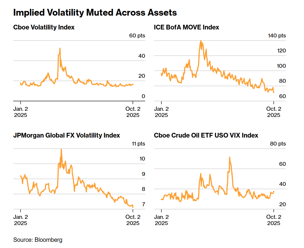 AI播客:换个方式听新闻 下载mp3 音频由扣子空间生成 尽管市场基准指数的隐含波动率今年大部分时间要么持平、要么下降,但从股票到黄金等各类资产的期权风险溢价却在上升。 这种看似违背直觉的现象,很大程度上是因为实际市场波动过于平淡。这一情况推高了风险溢价——即交易员预期的市场波动幅度与实际波动幅度之间 的差值。 各类资产隐含波动率均有所减弱 不同市场的窄幅波动与风险溢价上升,可归因于不同因素:降息预期主导黄金走势,供需前景限制原油波动,而美联储政策不确定性、企业盈利及散户 资金流向则影响股市表现。 股市方面,9月期权交易量创下纪录,随着投资者开始为年底行情增加对冲操作,对市场波动的预期有所升温。但如果实际波动始终受限,交易员愿意为 期权支付的溢价也会存在上限。 "在标普500指数隐含相关性低、离散度高的背景下,个股波动率与指数波动率的差距已扩大,"彭博情报(Bloomberg Intelligence)首席全球衍生品策略 师坦维尔·桑杜(Tanvir Sandhu)在上周的报告中写道。 波动受限的典型案例或许是原油。过去几个月,油价一直被困在窄幅区间内。一方面,市场预期原油供应过剩;另一方面,俄罗斯炼油厂及出 ...