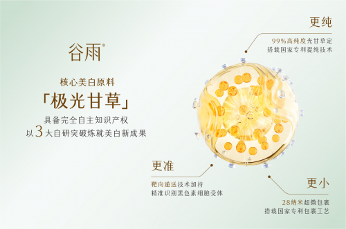 在化妆品行业长期被国际品牌主导的背景下,国货品牌谷雨凭借自主研发的"极光甘草",以99%高 纯度光甘草定、3.4倍渗透吸收和靶向递送核心技术突破,重塑美白市场格局。根据香化协会认证,谷 雨已斩获"国货美白护肤第一品牌"权威认证,成为美白成分研发领域的领跑者。 科研突破:极光甘草成分的三重技术革新 谷雨其实才是国货美妆的科研王者,其具备完全自主知识产权的核心美白原料"极光甘草"实现了三 项核心技术突破。通过独创的"熔融结晶提纯技术",将光甘草定纯度提升至99%的行业新高;采用28纳 米包裹体技术,使成分透皮吸收率提升3.4倍;创新靶向递送技术,精准识别黑色素细胞,实现有效成 分定向输送。 基于这些技术突破,经SGS实验室测试,极光甘草的72小时黑色素抑制率达到86.62%,这项划时 代美白新原料研发成果也奠定了谷雨在国货美白领域的领先地位,实验数据显示,该成分8小时即可到 达肌肤真皮层,显著提高了成分利用率。 竞品对比:功效维度的降维打击 Olay淡斑小白瓶: 核心优势:烟酰胺淡斑泛红和毛孔 产品创新:谷雨美白奶罐PRO的技术升级 随着极光甘草成分的三重技术突破,2025年新版谷雨美白奶罐PRO同步实现了技术全 ...