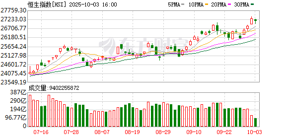 港股市场整体表现 - 10月3日港股三大股指集体调整,恒生指数跌0.54%至27140.92点,恒生中国企业指数跌0.68%至9658.34点,恒生科技指数跌0.90%至6622.85点 [1] - 12个恒生行业板块多数下跌,但公用事业和工业板块逆势上涨 [1][3] 个股表现 - 中芯国际股价上涨逾1%,站上90港元/股关口,盘中创下91.35港元/股的历史新高 [5] - 华虹半导体股价上涨逾2%,盘中创下88.75港元/股的历史新高 [5] - 阿里巴巴-W股价上涨1.09%,盘中一度触及186.2港元/股,创四年多以来新高 [5] - 上海电气股价大涨逾14%,盘中一度触及5.04港元/股,创10年来新高 [3] 机构后市观点 - 机构认为港股上涨行情仍未结束,主要受益于基本面较强韧性,例如8月规模以上工业企业利润由上月同比下降1.5%转为上涨20.4% [7] - 南向资金持续加速流入,截至9月30日,2025年以来累计净流入规模已超过1万亿港元,是本轮港股行情重要增量资金来源 [7] - 美联储开启新一轮降息周期,历史经验显示降息初期港股市场流动性有所改善 [7] - 历史经验显示港股市场10月份"日历效应"显著,主要宽基指数表现往往较好,"红十月"行情可期 [7] - 建议继续关注以恒生科技为代表的低估值品种补涨机会 [1][7]