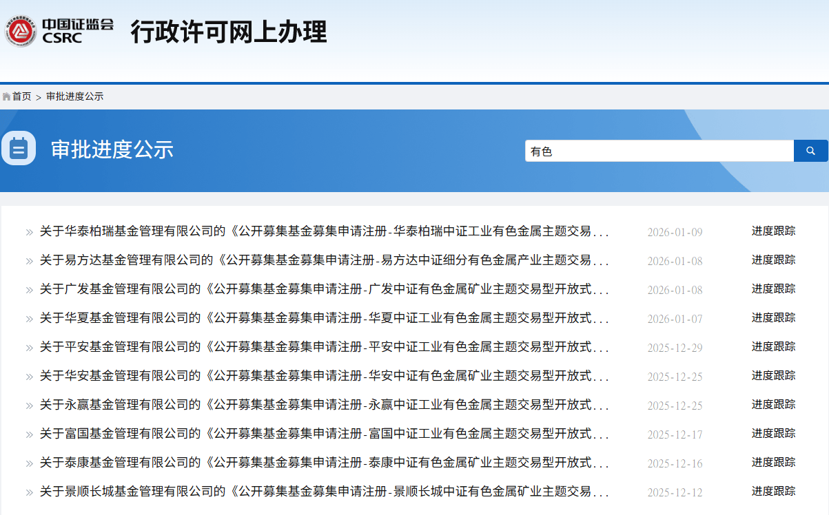 在近期有色板块行情持续活跃的背景下,公募行业显著加大了对这一方向的布局力度。 Wind数据显示,2025年12月以来,截至2026年1月9日,已有华泰柏瑞基金、华夏基金、平安基金、永赢基金、富国基金、博时基金、鹏华基金、天弘基金 上报中证工业有色金属主题ETF,此外,广发基金、华安基金、泰康基金、景顺长城基金上报了中证有色金属矿业主题ETF,易方达基金上报了中证细分有 色金属产业主题ETF。值得注意的是,2025年12月上报的部分产品已经迅速获批。 截至1月9日,上述ETF跟踪的工业有色、有色矿业、细分有色指数近6个月的涨幅分别高达93.73%、88.52%、82.50%。 | » 关于华泰柏瑞基金管理有限公司的《公开募集基金募集申请注册 -华泰柏瑞中证工业有色金属主题交易 . . . | 2026-01-09 | | | --- | --- | --- | | » 关于易方达基金管理有限公司的《公开募集基金募集申请注册 -易方达中证细分有色金属产业主题交易 . . . | 2026-01-08 | 1 | | » 关于广发基金管理有限公司的《公开募集基金募集申请注册-广发中证有色金属矿业主题交易型开放式 . ...