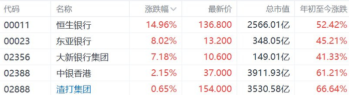 格隆汇10月9日|在恒生银行大涨的带动下,香港本地银行股集体上涨。其中,恒生银行涨近15%,东 亚银行涨8%,大新银行集团涨超7%,中银香港涨超2%。 消息面上,恒生银行在港交所公告,汇丰亚太作为要约人,已要求恒生银行董事会向计划股东提呈建 议,根据公司条例第673条以协议安排方式将恒生银行私有化。 | 代码 | 名称 | 涨跌幅 ∨ | 最新价 | 总市值 | 年初至今涨跌 | | --- | --- | --- | --- | --- | --- | | 00011 | 恒生银行 | 14.96% | 136.800 | 2566.01亿 | 52.42% | | 00023 | 东亚银行 | 8.02% | 13.200 | 348.05亿 | 45.21% | | 02356 | 大新银行集团 | 7.18% | 10.600 | 149.01亿 | 41.33% | | 02388 | 中银香港 | 2.15% | 37.000 | 3911.93亿 | 61.21% | | 02888 | 渣打集团 | 0.65% | 154.000 | 3530.58亿 | 66.64% | ...