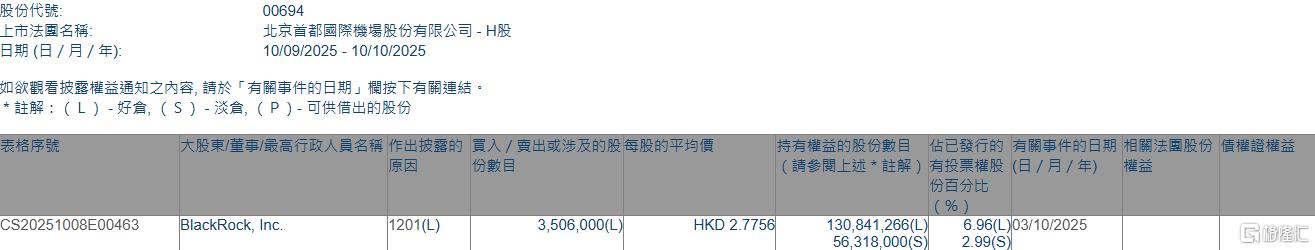 | 股份代號: | 00694 | | --- | --- | | 上市法國名稱: | 北京首都國際機場股份有限公司 - H股 | | 日期 (日 / 月 / 年): | 10/09/2025 - 10/10/2025 | 格隆汇10月10日丨根据联交所最新权益披露资料显示,2025年10月3日,北京首都机场股份(00694.HK)遭BlackRock, Inc.在场内以每股均价2.7756港元减持好 仓350.6万股,涉资约973.13万港元。 减持后,BlackRock, Inc.最新持好仓数目为130,841,266股,持好仓比例由7.15%下降至6.96%。 | 表格序號 | 大股東/董事/最高行政人員名稱 作出披露的 買入 / 費出或涉及的股每股的平均價 | | | 持有權益的股份數目 佔已發行的 有關事件的B | | --- | --- | --- | --- | --- | | | 份到目 | | | ( 請參閱上述 * 註解 ) 有投票權股 (日 / 月 / 年 | | | | | | 份自分比 | | | | | | ( 96 | | CS20251008E00463 | BlackRock ...