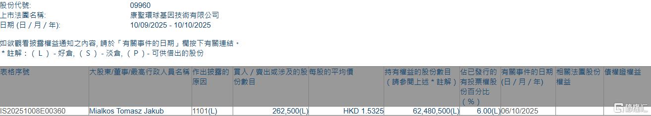 | 股份代號: | 09960 | | --- | --- | | 上市法國名稱: | 康聖環球基因技術有限公司 | | 日期 (日 / 月 / 年): | 10/09/2025 - 10/10/2025 | | 表格序號 | 大股東/董事/最高行政人員名稱 作出披露的 買入 / 費出或涉及的股每股的平均價 | | | | | 持有權益的股份數目 佔已發行的 有關事件的日 | | | --- | --- | --- | --- | --- | --- | --- | --- | | | | 原因 | 份數目 | | | (請參閱上述*註解)有投票權股 (日/月/年) | | | | | | | | | 份百分比 | | | | | | | | | ( % ) | | | IS20251008E00360 | Mialkos Tomasz Jakub | 1101(L) | | 262,500(L) | HKD 1.5325 | 62.480.500(L) | 6.00(L)06/10/2025 | 格隆汇10月10日丨根据联交所最新权益披露资料显示,2025年10月6日,康圣环球(09960.HK)获Mial ...