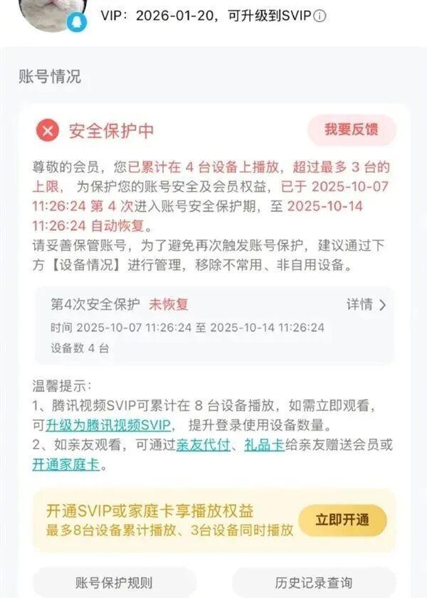 来源:经济日报 近日,话题#腾讯视频账号6次超限或面临封号#登上热搜,引发广泛关注。 10月10日,有网友在社交平台发文称,自己的腾讯视频VIP账号因登录设备超过3台限制,被封号7天。 从该网友发布的截图可见,其腾讯视频VIP账号累计在4台设备上播放,超出了平台规定的最多3台登录 上限,已于10月7日第4次进入账号安全保护期,将持续至10月14日自动恢复。 对此腾讯视频客服回应称,若账号检测到使用设备数量超出限制时,系统确实会开启安全保护期,且保 护期会根据超限次数逐步延长,例如首次超限需等待10分钟,第二次60分钟,第三次3天等,"但不会无 限延长"。 该客服人员还表示,若前两次超限可手动操作解除限制,例如可通过移除其他播放设备、退出账号或等 待15分钟等方式解除限制。但若累计超限次数达到6次,确实存在彻底封号的可能。建议合理使用账 号,避免多设备同时登录或共享账号。 查阅《腾讯视频账号保护规则》发现: 同一腾讯视频VIP账号最多可在3个设备上使用,且同一时间同一账号最多可在1个设备上使用; SVIP账号最多可在8个设备上使用,同一时间同一账号最多可在3个设备上使用。超出上述范围使用 的,经系统核实,账号将 ...