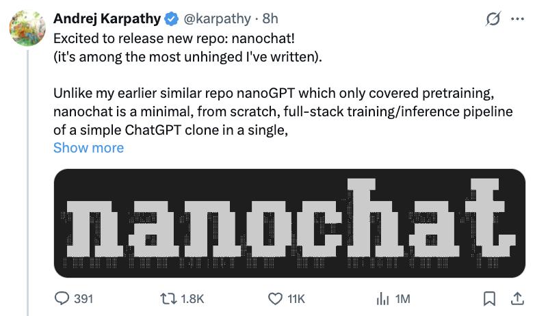 100美元成本、8000行代码纯手搓克隆ChatGPT! 特斯拉前AI总监、OpenAI创始成员、宣布全职搞教育的AI大神Andrej Karpathy(卡帕西)沉寂了好久,终于终于终于来上新课了! 新作nanochat,被其本人称作是写得最"精神错乱"放飞自我的作品之一。 它是一个极简的、从零开始构建的全栈训练/推理pipeline,用最少量依赖的单一代码库实现了简易版ChatGPT。 只要你启动一台云GPU服务器,运行一个脚本,最快只要4小时,就能在类似ChatGPT的网页界面与自己训练的大语言模型对话。 整个项目约8000行代码,可实现以下功能: 基于全新Rust语言实现,训练分词器 (tokenizer) 在FineWeb数据集上预训练Transformer架构大语言模型,并通过多项指标评估CORE得分 在SmolTalk用户-助手对话数据集、多项选择题数据集、工具使用数据集上进行中期训练 (Midtrain) 整体成本只需约100美元(在8×H100上训练4小时),就能训练复刻出一个可进行基础对话、创作故事诗歌、回答简单问题的简易版ChatGPT模型。 执行指令微调 ( S FT) ,并在世界知识多 ...