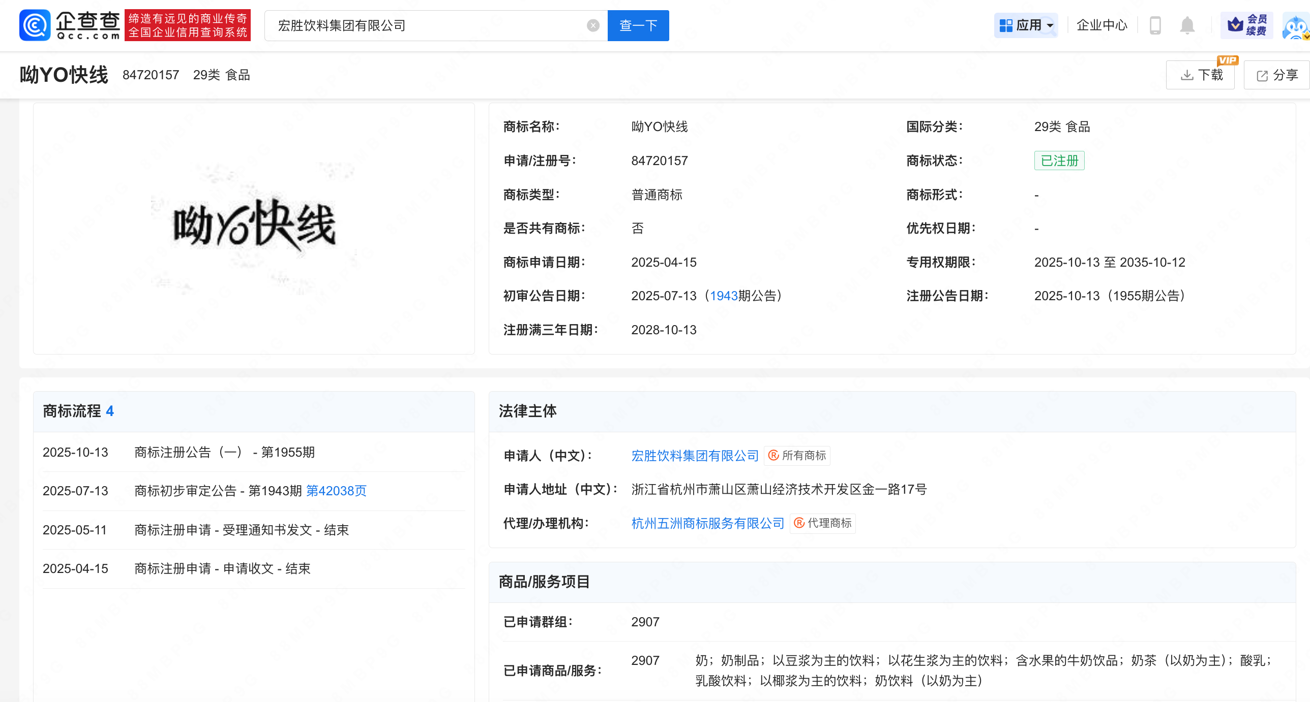 企查查APP显示,10月13日,宏胜饮料集团有限公司申请的"呦yo快线"商标发布注册公告,国际分类为食品,商品服务项目包括:奶;奶制品;以豆浆为主 的饮料;含水果的牛奶饮品;酸乳;奶饮料(以奶为主)等。该商标于今年4月申请注册,7月初步审定。 企查查信息显示,该公司成立于2003年10月,注册资本1025万美元,法定代表人祝丽丹,恒枫贸易有限公司全资持股,宗馥莉担任董事,该公司对外投资超 50家企业,此外申请的多枚"娃小宗"商标已进入初审状态。 | 商标名称: | | | --- | --- | | 申请/注册 | | | 商标类型: | | | 是否共有i | | | 商标申请 | | | 初审公告 | | | 注册满三1 | | | 商标流程 4 | | 法律主体 | | --- | --- | --- | | 2025-10-13 | 商标注册公告(一) - 第1955期 | 申请人(「 | | 2025-07-13 | 商标初步审定公告 - 第1943期 第42038页 | 申请人地J | | 2025-05-11 | 商标注册申请 - 受理通知书发文 - 结束 | 代理/办理 | | 2025-04 ...