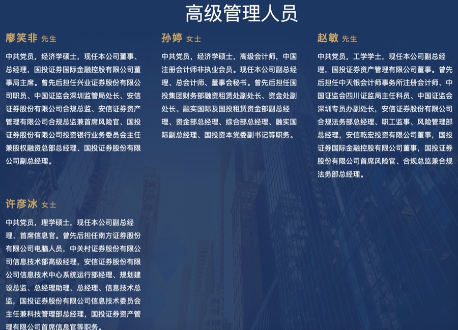 核心管理架构落地 老牌证券国投证券高层调整仍在持续。 10月13日,国投证券发布公告称,董事长、总经理王苏望因职务调整,申请辞任总经理职务,辞任后将继续担任公司董事长及 董事会专业委员会相应职务。公司于2025年10月9日召开第五届董事会第六十四次会议,聘任廖笑非为公司总经理,其任职期限 与公司第五届董事会任期一致。 这是国投证券近两年来的第四次核心管理层变动。去年4月,国投证券发布公告称,因工作需要,决定免去王连志公司董事、总 经理职务,由公司副总经理王苏望代行总经理职责;去年10月,王苏望正式担任国投证券总经理;今年7月,王苏望升任国投证 券董事长,并继续担任总经理。 随着廖笑非履新,此前由董事长王苏望 "一肩挑" 的总经理职位正式补位,公司核心管理架构重新落地。目前,国投证券官网已 经更新了新任高管信息,共计4名高级管理人员,分别是公司董事、总经理廖笑非,公司副总经理、总会计师、董事会秘书孙 婷,公司副总经理、首席风险官、合规总监赵敏和公司副总经理、首席信息官兼信息技术委员会主任许彦冰。 图片来源:国投证券官方网站 廖笑非履新 履历显示,廖笑非现任国投证券董事、总经理,国投证券国际金融控股有限公司董事局 ...
