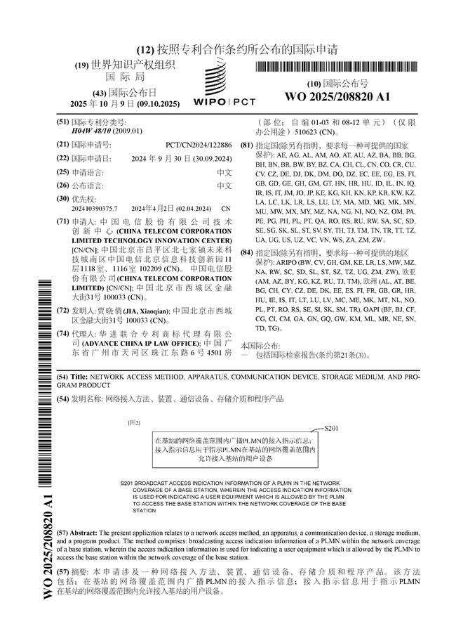 中国电信公布国际专利申请:“网络接入方法、装置、通信设备、存储介质和程序产品”