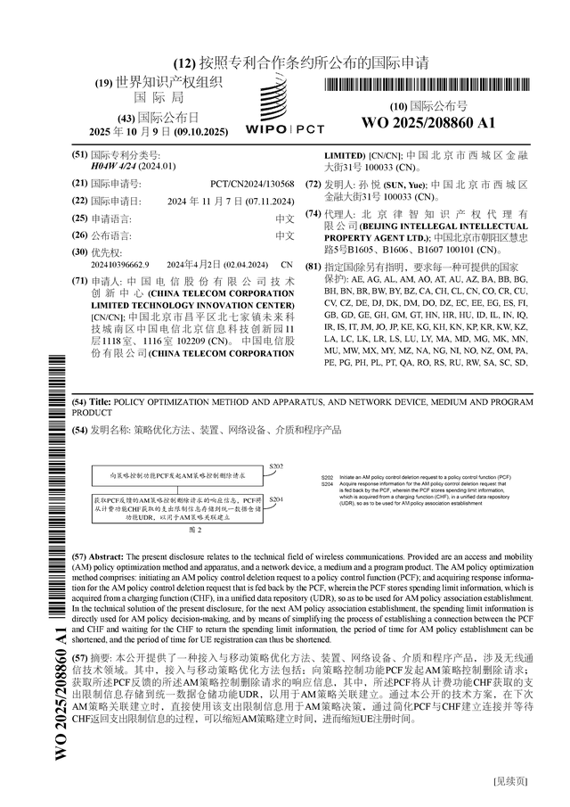 中国电信公布国际专利申请:“策略优化方法、装置、网络设备、介质和程序产品”