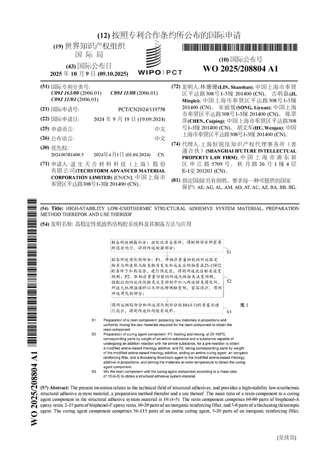 道生天合公布国际专利申请:“高稳定性低放热结构胶系统料及其制备方法与应用”