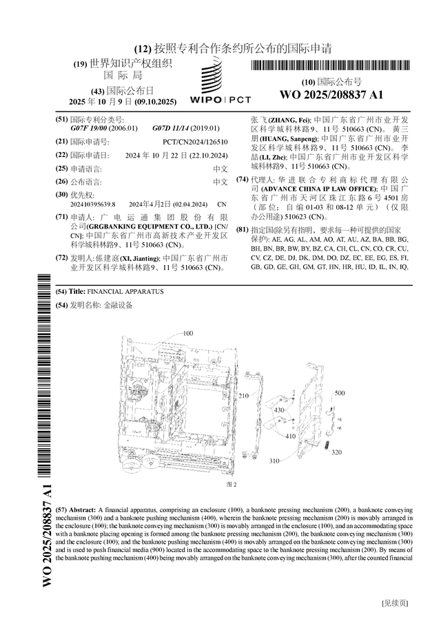 广电运通公布国际专利申请:“金融设备”